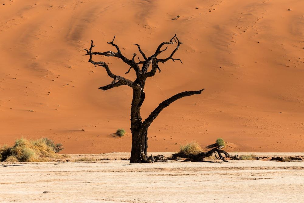 Sossusvlei to gliniasta depresja otoczona przez gigantyczne czerwone wydmy. W pobliżu znajduje się Deadvlei, tzw. Martwa Dolina słynąca z powyginanych, martwych drzew akacjowych na tle białej gliny i pomarańczowych wydm, które tworzą niezwykły, niemal apokaliptyczny krajobraz.