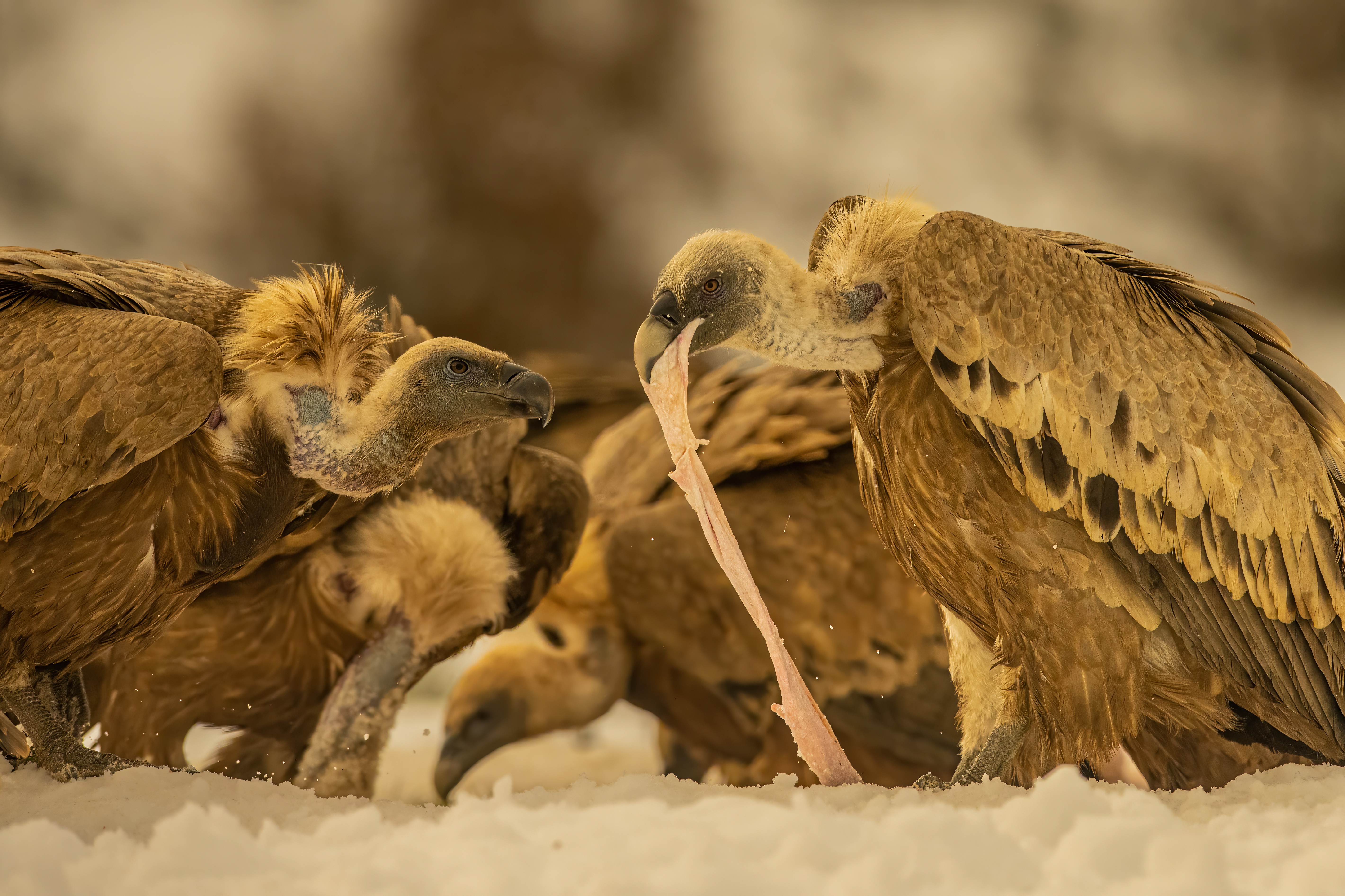 Sępy płowe, wielkie ptaki o pierzastych kryzach wyglądających jak szale „boa” u wytwornych dam z Belleépoque; jastrzębiowate o mocnych zakrzywionych dziobach i hakowato wygiętych długich szyjach – po co? Po to, by móc wprawnie dobierać się do wnętrzności i – przeniknąwszy przez powłoki skórne – rozrywać trzewia padłych ofiar.