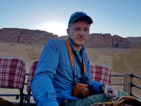 Życie w drodze jest fajne. Zawodowo zajmuje się turystyką wypoczynkową, prowadząc własne biuro podróży. Pracuje też na lotnisku, koordynując odprawy czarterowe, a w wolnym czasie pomaga przy tworzeniu rowerowych torów pumptrack. Z wykształcenia geograf oraz spec od psychologii w biznesie. Bliskie związki z turystyką powodują, że dosyć regularnie przemierza kraje Afryki Północnej, całego basenu Morza Śródziemnego i Wysp Kanaryjskich, zagląda do Tanzanii i gdy czas pozwoli, dla zbilansowania temperatur, na Półwysep Skandynawski. Gdy dawno temu, za namową Joanny organizował pierwszą wyprawę do Iranu, nie sądził, że kierunek Wschód stanie mu się tak bliski. Po tym wyjeździe były kolejne irańskie przygody, a także eskapady do Omanu, ZEA, Maroko, Turcji, Izraela, Jordanii i ostatnio Arabii Saudyjskiej. Choć oczywiście na początku była Polska i różne niezapomniane włóczęgi z klubem PTTK. Później - Europa. Czym się dało i jak się dało, z dziećmi i bez. Wzdłuż i wszerz. Autostopem, pociągiem, samochodem, no i… tak zawsze najlepiej- rowerem, który, jeśli ma przed nim jeszcze jakieś tajemnice, to tylko takie malutkie :) Zapalony fan dwóch kółek. Pasjonat MTB w wersji ścieżkowej i klasycznej szosy, na regularnych ustawkach w Poznaniu. Pasjonat gry w tenisa i dobrej muzyki. Świat uwiecznia w obiektywie aparatu, a pisanie o sobie woli zostawić innym. Dla Horyzontów prowadzi wyprawy rowerowe- do Włoch, Chorwacji, Łotwy, Estonii i Francji. W czasie wyjazdów najważniejsze są dla niego bezpieczeństwo uczestników i dobra atmosfera.