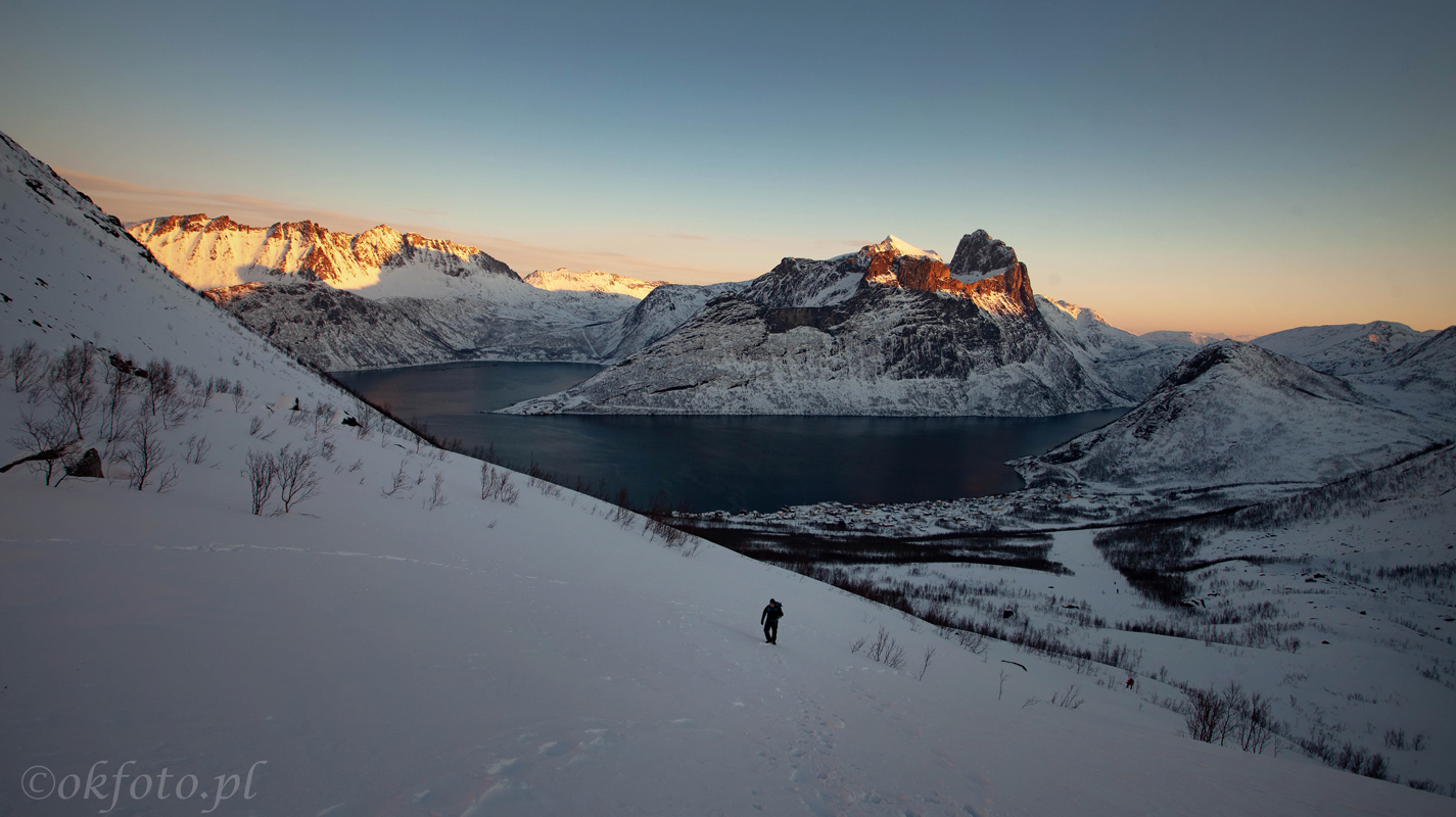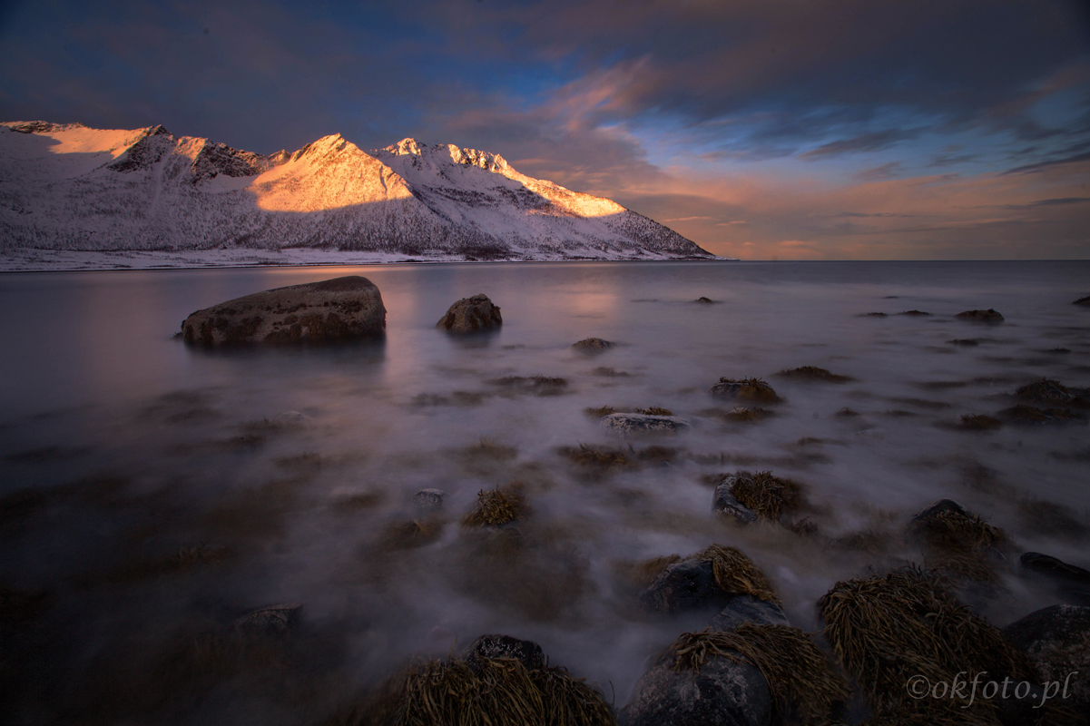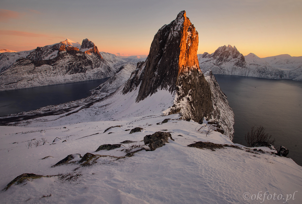 Wzdłuż wybrzeży Senji biegnie wygodna szosa, pozwalająca łatwo przemieszczać się między najlepszymi miejscówkami. Kolejne fiordy odsłaniają coraz to nowe i bardziej olśniewające widoki. W niektórych miejscach fotografuje się z góry, w innych – z brzegu morza. Nisko zawieszone słońce sprawia, że światło przez cały dzień jest wspaniałe. A kiedy słońca nie widać, krajobraz nic na tym nie traci: ciężkie chmury świetnie komponują się z ośnieżonymi szczytami.