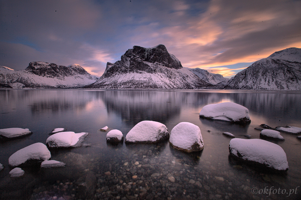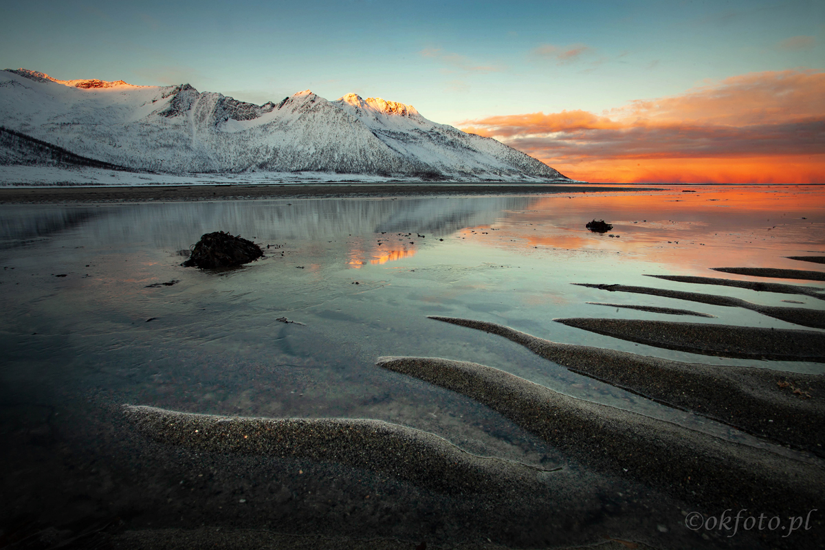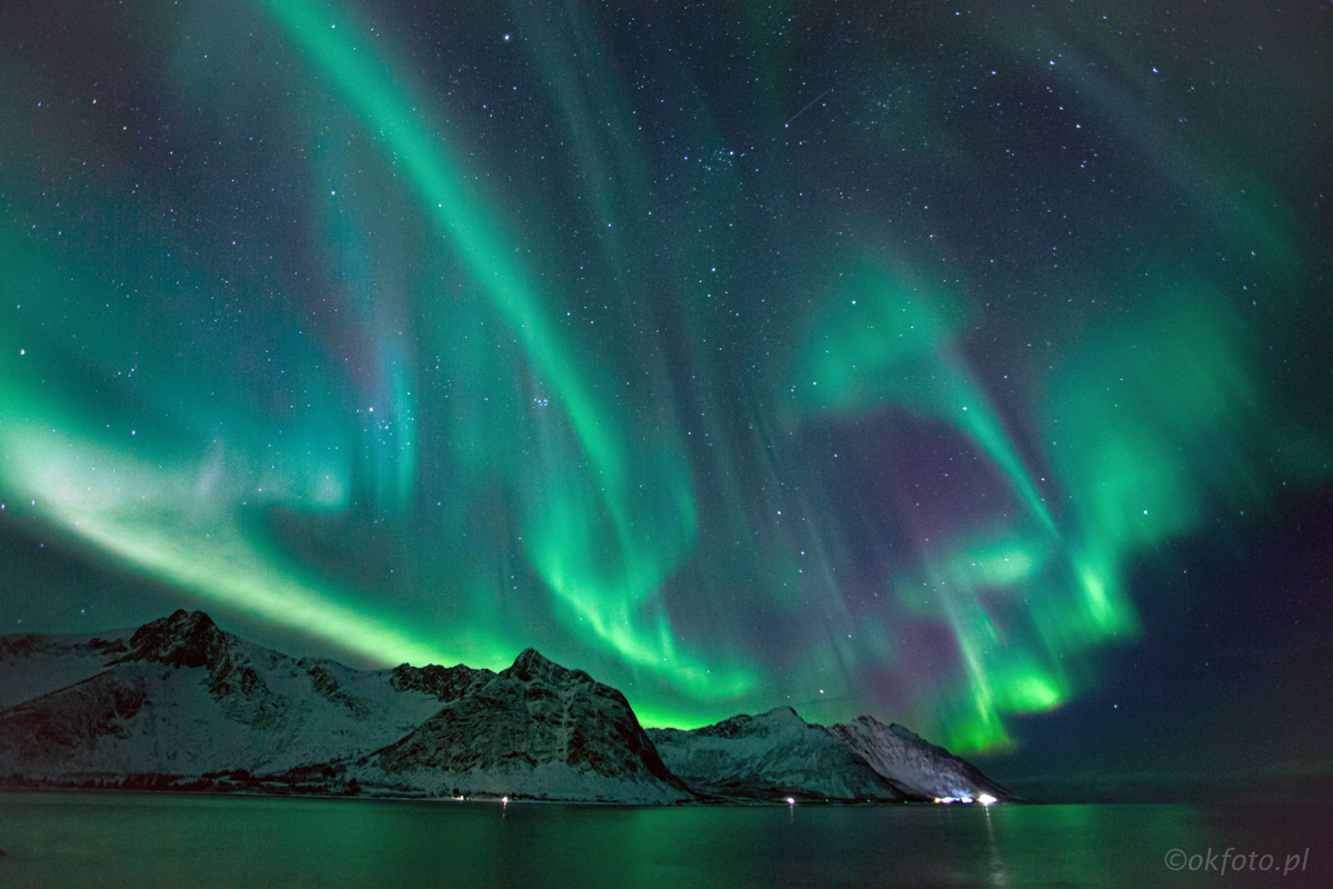 Zimą dni są dość krótkie (a czasami ich w ogóle nie ma, ale ten okres nas nie dotyczy), nie ma się jednak czym przejmować. W nocy nasza aktywność się nie skończy: uzbrojeni w szerokokątne obiektywy (jak najszersze!) będziemy wypatrywać na niebie zielonych rozbłysków. Oczywiście nie ma stuprocentowej gwarancji, że się pojawią, ale prawdopodobieństwo jest bardzo wysokie. Wystarczy kilka godzin czystego nieba. A jeśli nie będzie czyste, albo będzie tylko częściowo, fotografujemy dalej: ośnieżone góry nad wodą dobrze wyglądają również w nocy.