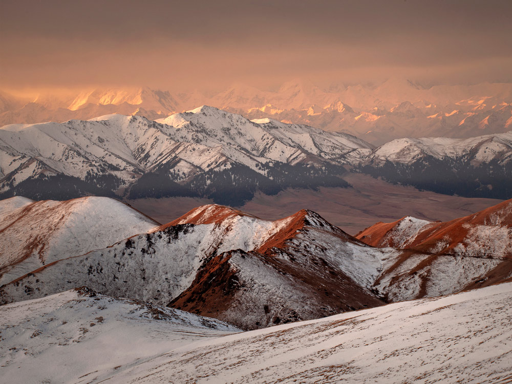 - Stepy z pasącymi się końmi i potężnym Tienszanem w tle