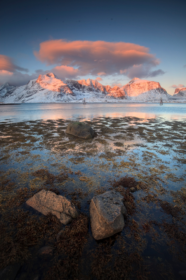 Archetyp skandynawskiego krajobrazu to czerwone domki stojące na palach, częściowo w wodzie, oraz wznoszące się za nimi majestatyczne góry. W rzeczywistości takie pejzaże można zobaczyć tylko w nielicznych miejscach, a jednym z najpiękniejszych są Lofoty: zachwycający archipelag, który głęboko wcina się w Morze Norweskie. Te budynki to tzw. rorbuer (w liczbie pojedynczej rorbu). Dawniej służyły rybakom, a obecnie większość została przekształcona w domki wakacyjne. Drugim charakterystycznym elementem lokalnego krajobrazu są drewniane żerdzie, służące do suszenia dorszy, które poławia się zimą. Wysuszony na wiór dorsz to tzw. sztokfisz, czyli lokalny przysmak.